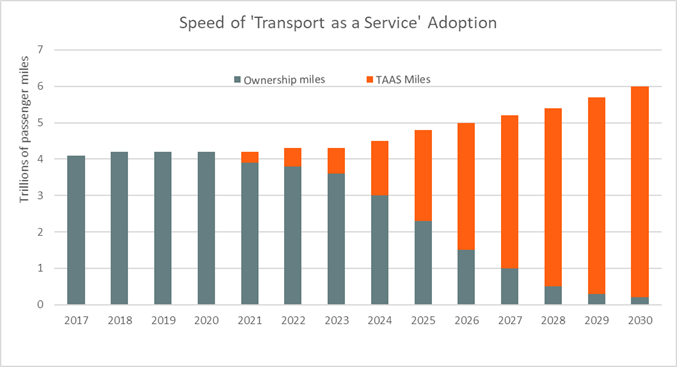 “We are on the cusp of the fastest, deepest, most consequential disruption of transportation in history. By 2030 … 95 percent of U.S. passenger miles travelled will be served by on-demand autonomous electric vehicles owned by fleets, not individuals, in a new business model we call ‘transport-as-a-service’.”